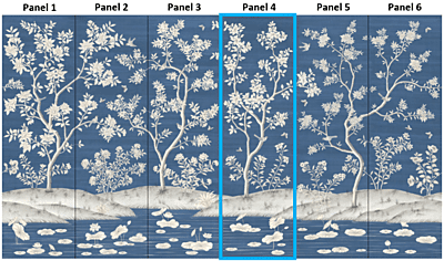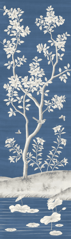 Inspired by traditional Chinese bird-and-flower scenic wallpaper popularized by Europe in the 18th and 19th Centuries, this design features towering trees and flowering bushes that sit above a tranquil pond with floating lily pads and lilies. Designed to allow for trimming some of the pond and/or tops of the trees, our Lily printed scene presents the look of antique wallpaper installations in the tradition of the grand homes of Europe. Each panel measures 3'w x 10'h, and the full repeat is 6 panels wide, with panel 6 connecting to panel 1. The panels can be ordered individually in any quantity, and the minimum order is 1 panel. The background of Navy Lily was painted to have a visible strié effect.