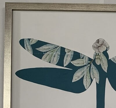 Handpainted dragonfly with inset floral design on pieced and antiqued bold blue background. Exact design layout within each animal will vary as these are unique, handpainted works. In silver box frame with patina. 24"W X 24"H.