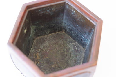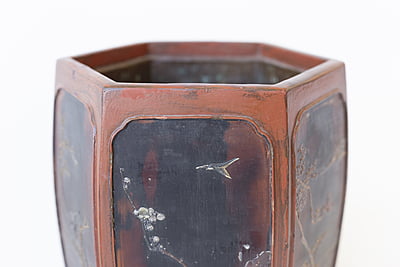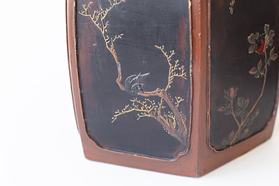 A pair of hexagonal Japanese lacquer cache pots. Each side has raised design with branches, birds and flowers.