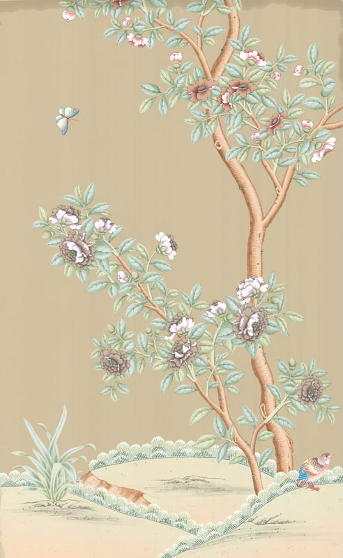 Handpainted Wallpaper panel 37.5" W X 59.5" H Water stains at edges, with on minor tear at left edge