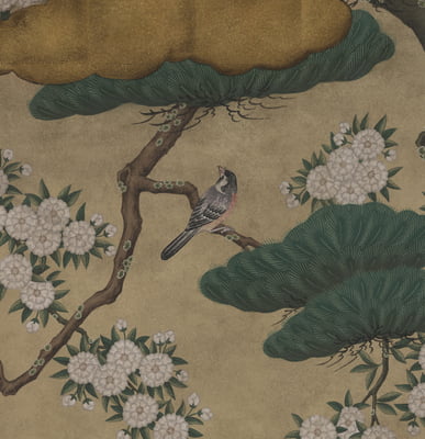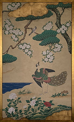 Handpainted Japanese design inspired by a Kano school screen in a colorful palette on a gold tea leaf background. In a gold frame with patina. 37.75"W X 63.75"H. Complementing pair available.