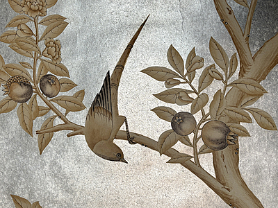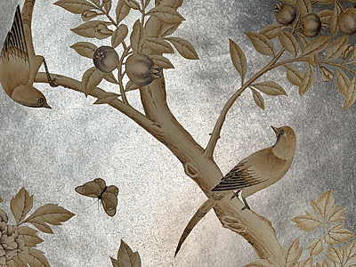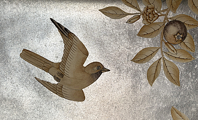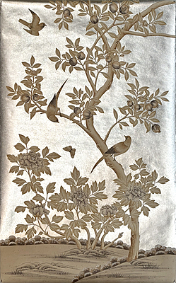 Custom handpainted sample. Sepia Garden (SY-206) design on Solid Silver ground. 60.5"H X 37.75"W.