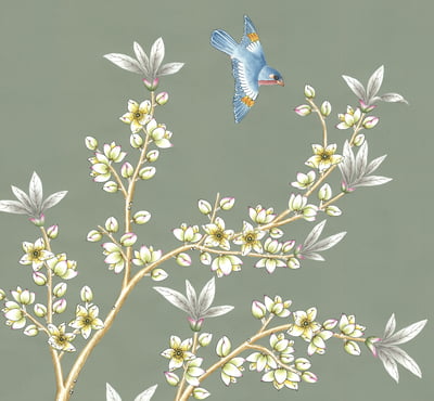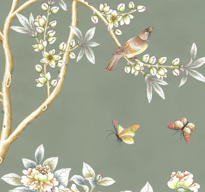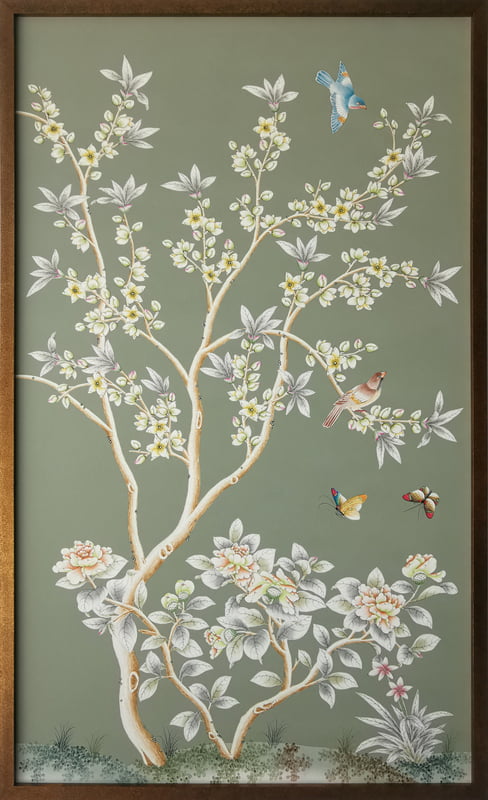 Handpainted chinoiserie design with flowers, birds, and butterflies on a soft celadon background. In gold frame with patina. 37.75"W X 63.75"H. Part of an available triptych.