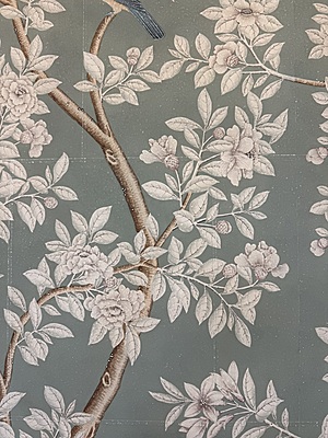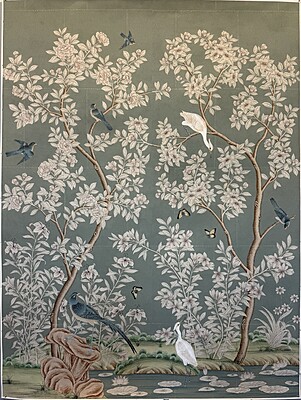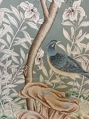 Handpainted flower & bird design (SY-205) on a pieced blue background. Mounted on muslin. 95.5"H X 71.5"W.