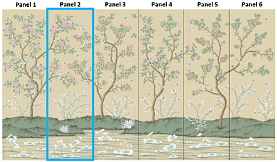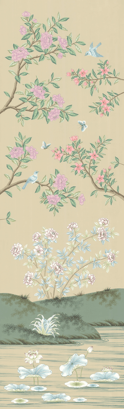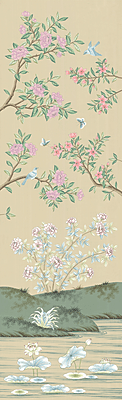 Inspired by traditional Chinese bird-and-flower scenic wallpaper popularized by Europe in the 18th and 19th Centuries, this design features towering trees and flowering bushes that sit above a tranquil pond with floating lily pads and lilies. Designed to allow for trimming some of the pond and/or tops of the trees, our Lily printed scene presents the look of antique wallpaper installations in the tradition of the grand homes of Europe. Each panel measures 3'w x 10'h, and the full repeat is 6 panels wide, with panel 6 connecting to panel 1. The panels can be ordered individually in any quantity, and the minimum order is 1 panel.