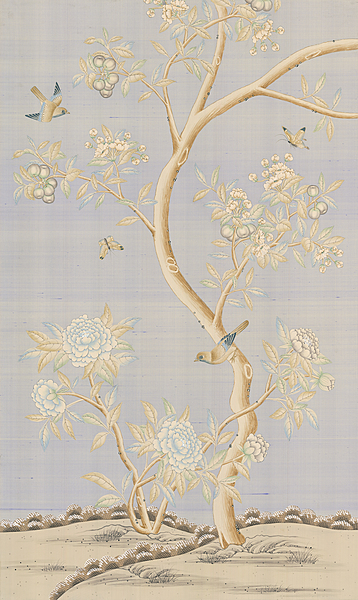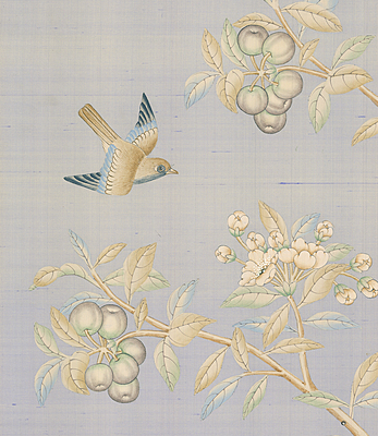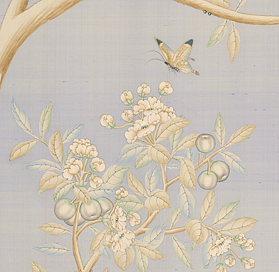 Mist Blossom (SY-650) handpainted wallpaper sample. On a silk background. 61.75"H X 37"W.