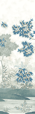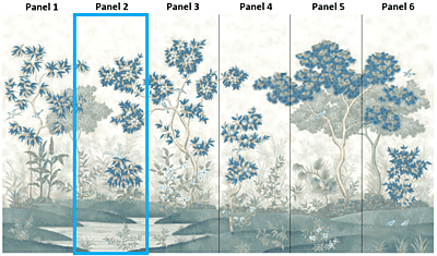 Our Grove design was inspired by Roman frescoes found intact in ancient villas and give the impression of a lush tropical garden. Our scene was designed to be able to trim from the top and/or the bottom and still envelop you in a peaceful surround. Each panel measures 3'w x 10'h, and the full repeat is 6 panels wide, with panel 6 connecting to panel 1. Panels can be ordered individually in any quantity, and the minimum order is 1 panel.