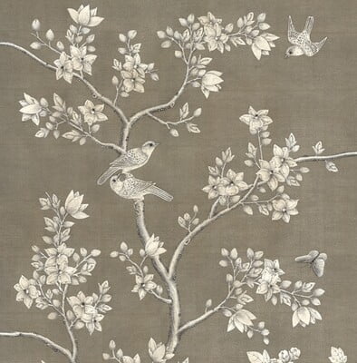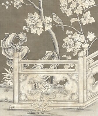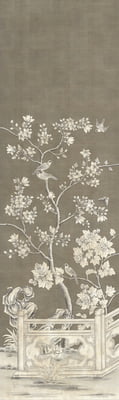 Handpainted chinoiserie design in an ivory and gray palette on a pewter Tea Leaf background.
