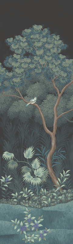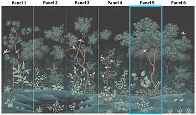 Our Grove design was inspired by Roman frescoes found intact in ancient villas and give the impression of a lush tropical garden. Our scene was designed to be able to trim from the top and/or the bottom and still envelop you in peaceful surround. Each panel measures 3'w x 10'h, and the full repeat is 6 panels wide, with panel 6 connecting to panel 1. Panels can be ordered individually in any quantity, and the minimum order is 1 panel.