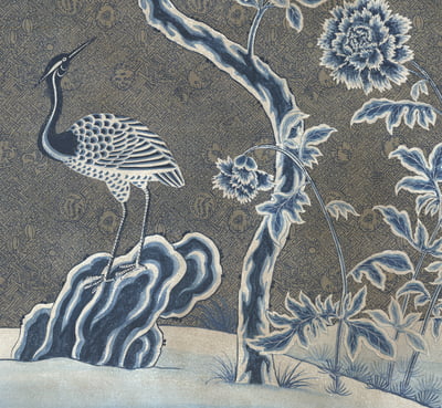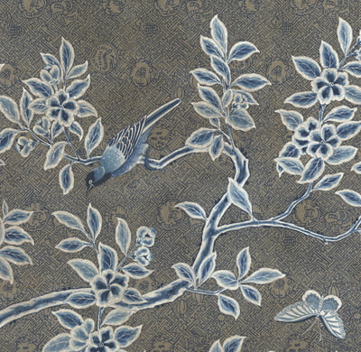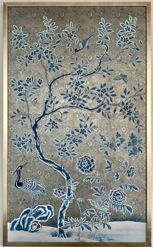 Handpainted Chinese design in a bold blue and white palette on a fretwork patterned silver tea leaf background. Background is antiqued. In silver box frame with patina. 37.75"W X 63.75"H. Complementing pair available.