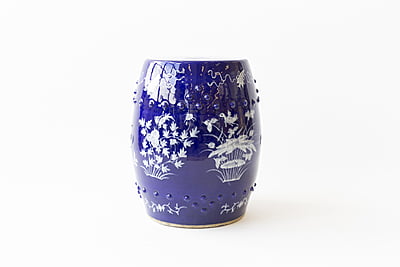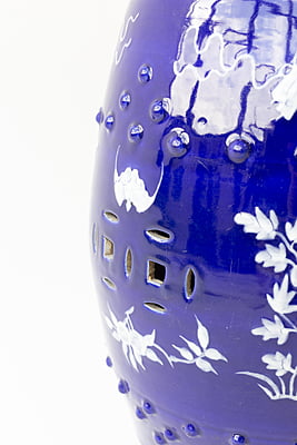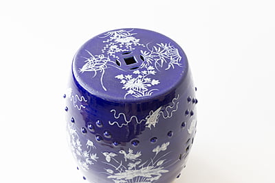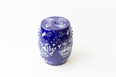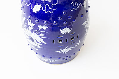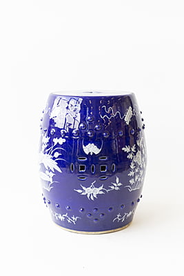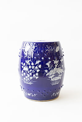 A Chinese blue and white garden seat with floral design.15"W X 18"H