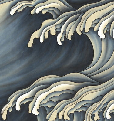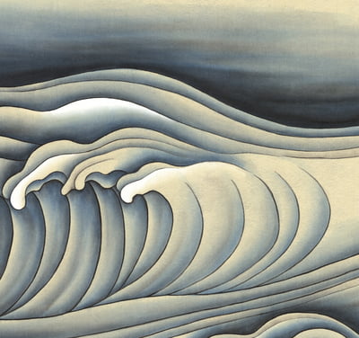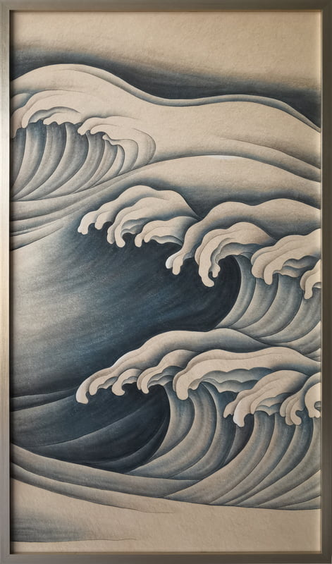 Handpainted Japanese wave design in a blue palette on a white vinyl background. In a silver frame with patina. 37.75"W X 63.75"H. Part of an available triptych.