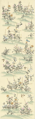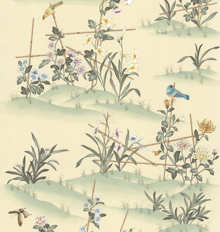 Handpainted all-over wallpaper. Each panel has identical handpainted design. 36"W X 120"H.