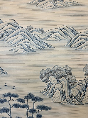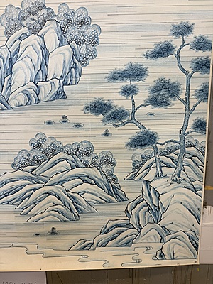 Handpainted landscape & figure design (SY-226) in tones of blue and white porcelain. Mounted on muslin. 96"H X 71.5"W.