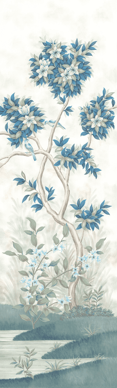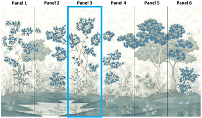 Our Grove design was inspired by Roman frescoes found intact in ancient villas and give the impression of a lush tropical garden. Our scene was designed to be able to trim from the top and/or the bottom and still envelop you in a peaceful surround. Each panel measures 3'w x 10'h, and the full repeat is 6 panels wide, with panel 6 connecting to panel 1. Panels can be ordered individually in any quantity, and the minimum order is 1 panel.