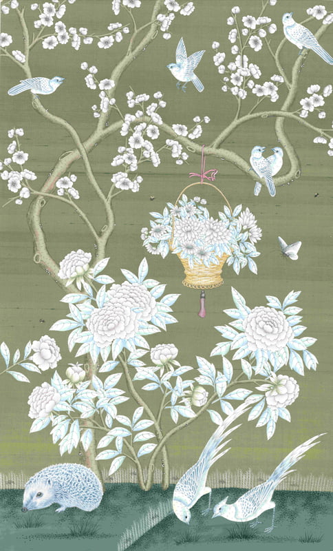 Handpainted wallpaper panel 37.5" W X 61.5" H Green silk background
