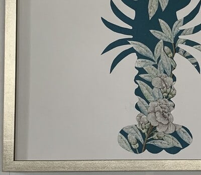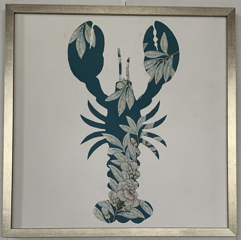 Handpainted lobster with inset floral design on pieced and antiqued bold blue background. Exact design layout within each animal will vary as these are unique, handpainted works. In silver box frame with patina. 24"W X 24"H.