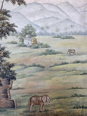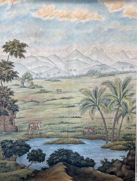 Colorful and detailed handpainted scene of India. Mounted on muslin. 95.5"H X 71.5"W.
