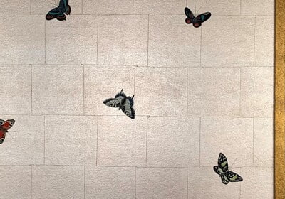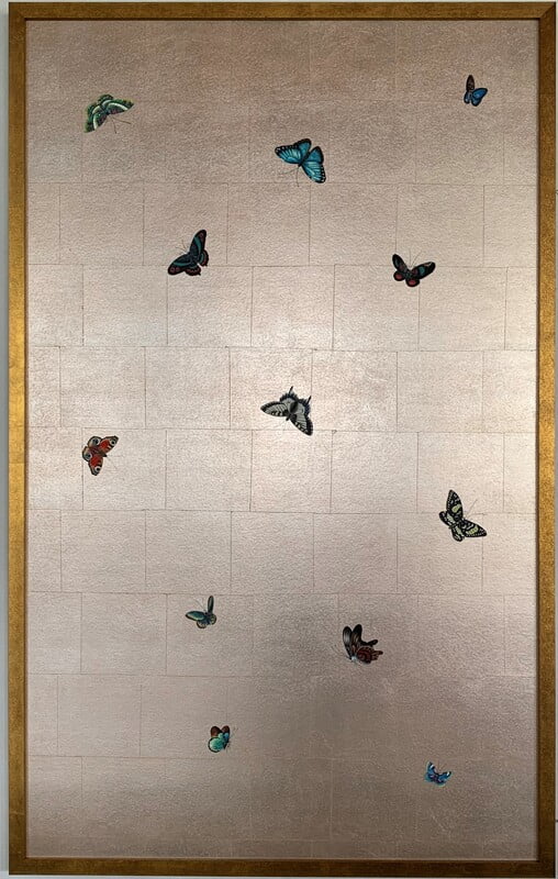 Handpainted butterflies floating on a Rose Tea Leaf background. Butterfly composition varies slightly in each piece as these are unique, handpainted pieces. In gold box frame with patina. 37.75"W X 63.75"H. Complementing pair available.