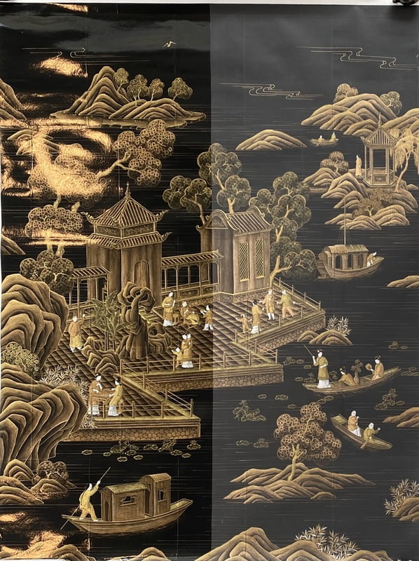 Handpainted landscape and figure gold design on black background. Left half with high gloss lacquer. Mounted on muslin. 95"H X 71"W.