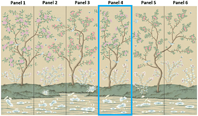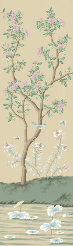 Inspired by traditional Chinese bird-and-flower scenic wallpaper popularized by Europe in the 18th and 19th Centuries, this design features towering trees and flowering bushes that sit above a tranquil pond with floating lily pads and lilies. Designed to allow for trimming some of the pond and/or tops of the trees, our Lily printed scene presents the look of antique wallpaper installations in the tradition of the grand homes of Europe. Each panel measures 3'w x 10'h, and the full repeat is 6 panels wide, with panel 6 connecting to panel 1. The panels can be ordered individually in any quantity, and the minimum order is 1 panel.