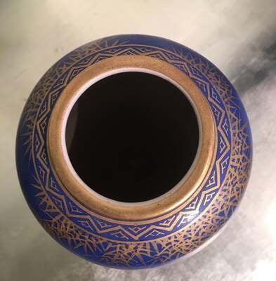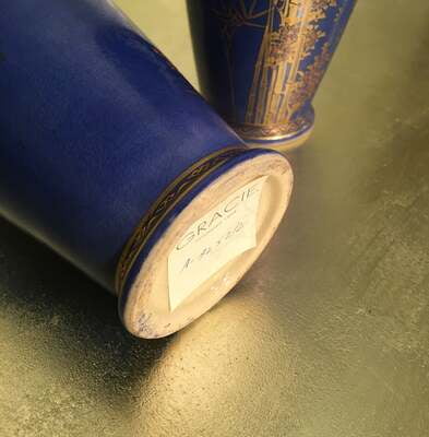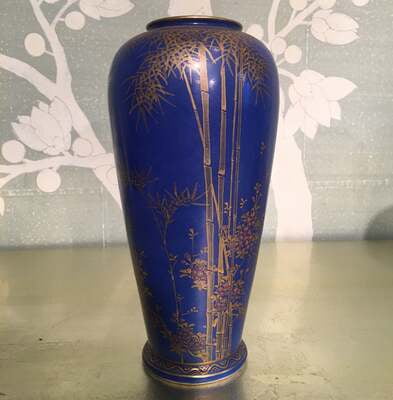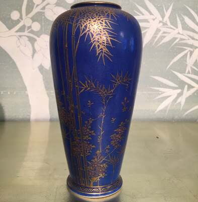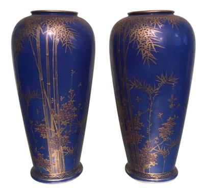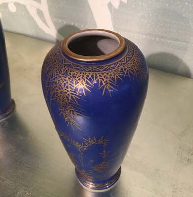 A pair of cobalt blue vases with design of bamboo in gold. 3 1/2"W X 8 1/4"H EA