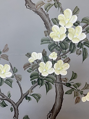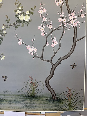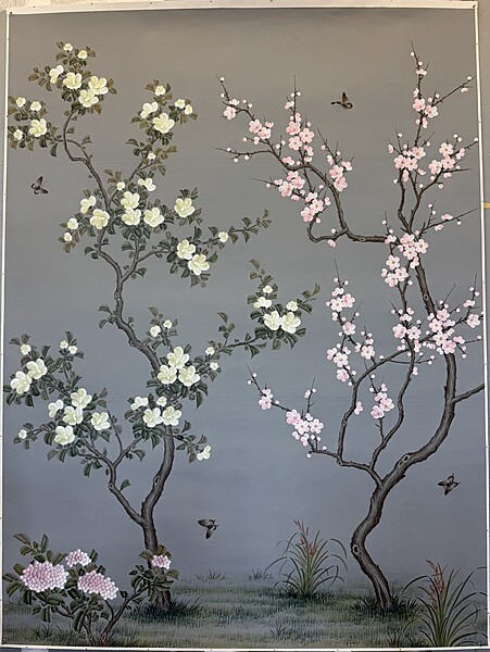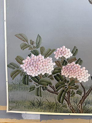 Handpainted floral design (SY-500) on slate background. Mounted on muslin. 95.5"H X 71.5"W.