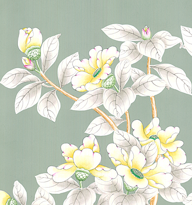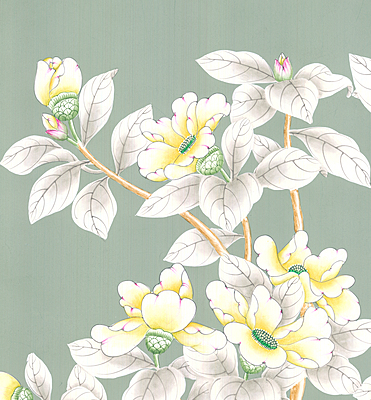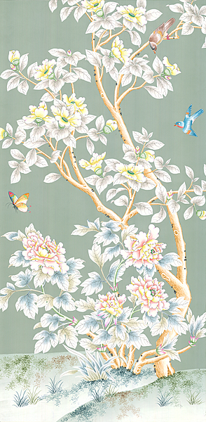 Handpainted Celadon Garden wallpaper sample. On muslin backing. 58"H X 29"W.