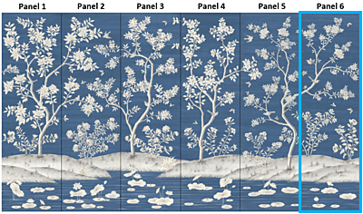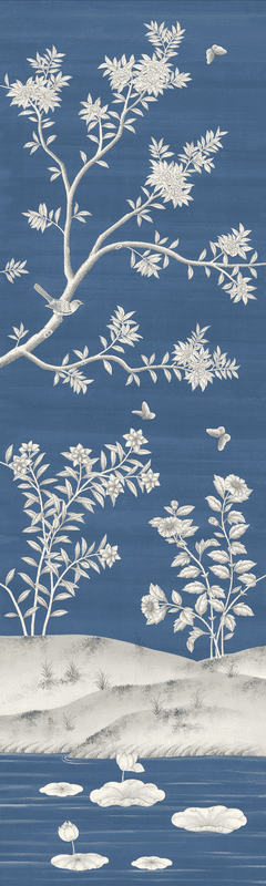 Inspired by traditional Chinese bird-and-flower scenic wallpaper popularized by Europe in the 18th and 19th Centuries, this design features towering trees and flowering bushes that sit above a tranquil pond with floating lily pads and lilies. Designed to allow for trimming some of the pond and/or tops of the trees, our Lily printed scene presents the look of antique wallpaper installations in the tradition of the grand homes of Europe. Each panel measures 3'w x 10'h, and the full repeat is 6 panels wide, with panel 6 connecting to panel 1. The panels can be ordered individually in any quantity, and the minimum order is 1 panel. The background of Navy Lily was painted to have a visible strié effect.