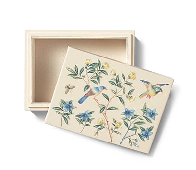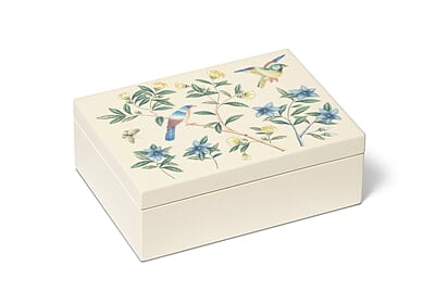 Lidded box with a smooth lacquer finish, enhanced with details from the Heathcote scene. A luxurious suede interior keeps small pieces of jewelry safe and organized. The box provides a fresh look that works in both contemporary and traditional interiors and is a perfect addition to a vanity. Lacquer with brass and suede lining. 2.8"H X 5.9"D X 8"W