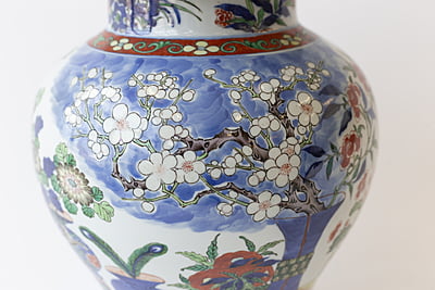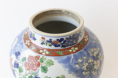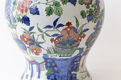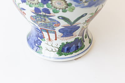 A very large Wucai (five color) temple jar with vibrant glaze, and design of vases, pomegranates and flowers. Double ring marking at base. Jar: 16" high.10"W X 18" high.