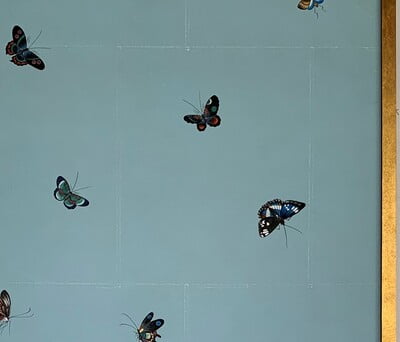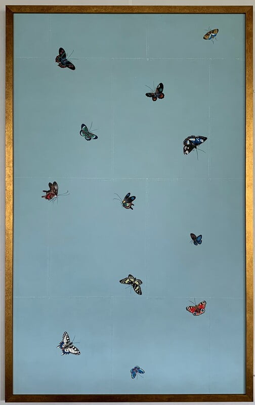 Handpainted butterflies floating on a Robin's Egg pieced background. Butterfly composition varies slightly in each piece as these are unique, handpainted pieces. In gold box frame with patina. 37.75"W X 63.75"H. Complementing pair available.