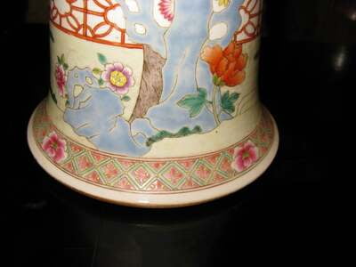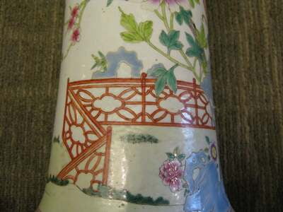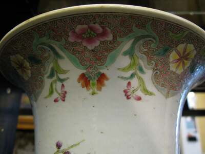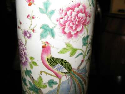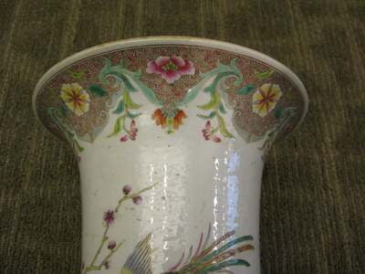 Large and graceful antique Chinese beaker shaped vase. Famille rose palette, with design of blooming peonies, fence, exotic birds and intricate borders. 5" diameter at middle X 16 1/2"H.