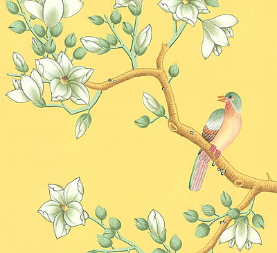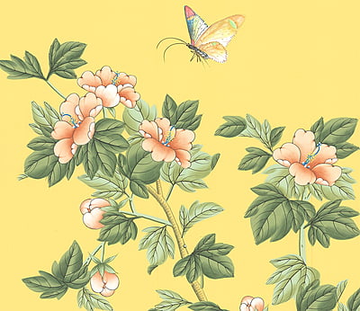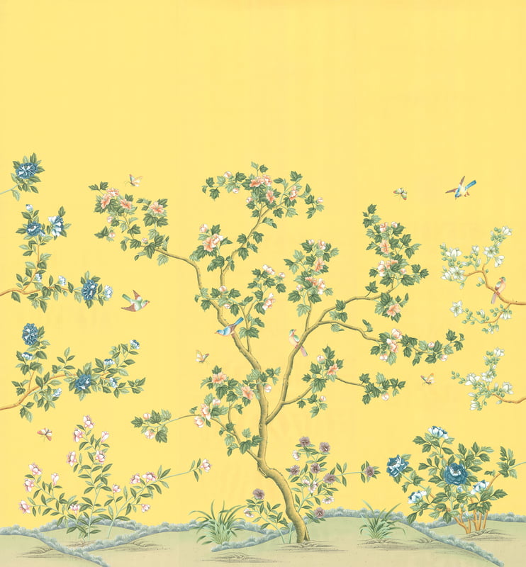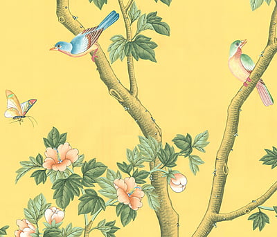Handpainted Chinese design with flowering trees, birds, and butterflies on a yellow background. Background is non-pieced and non-antiqued. 3 panels at 3'W X 10'H each with a 90" maximum design height.