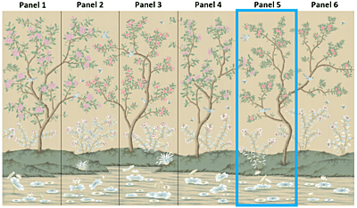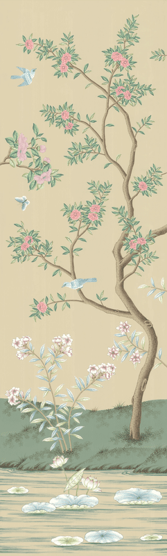 Inspired by traditional Chinese bird-and-flower scenic wallpaper popularized by Europe in the 18th and 19th Centuries, this design features towering trees and flowering bushes that sit above a tranquil pond with floating lily pads and lilies. Designed to allow for trimming some of the pond and/or tops of the trees, our Lily printed scene presents the look of antique wallpaper installations in the tradition of the grand homes of Europe. Each panel measures 3'w x 10'h, and the full repeat is 6 panels wide, with panel 6 connecting to panel 1. The panels can be ordered individually in any quantity, and the minimum order is 1 panel.