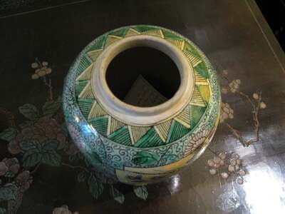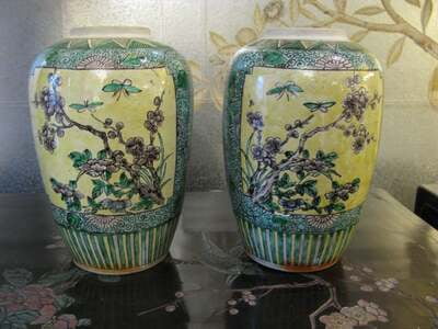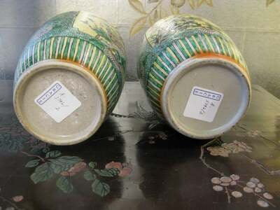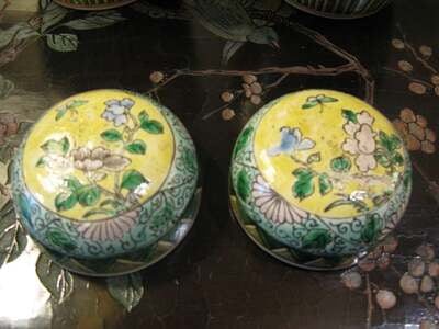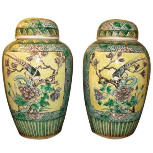 A pair of Chinese bisque jars, circa 1890-1910, with floral and bird design in panels, surrounded by vines, flowers and scrolling borders. With striped borders at base and lids. Colors are yellow, green, grey, blue, white and black. 6"W X 10"H EA.