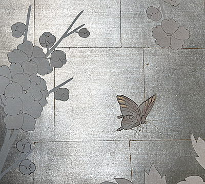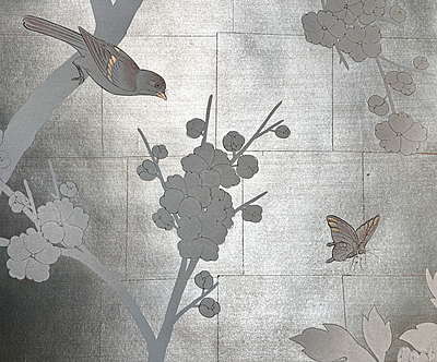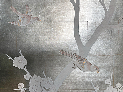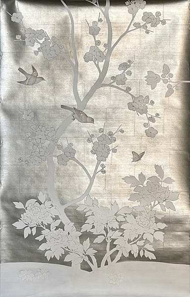 Handpainted wallpaper sample. SY-236 on a custom Tea Leaf background. 61"H X 38"W. Some wrinkles at edges.