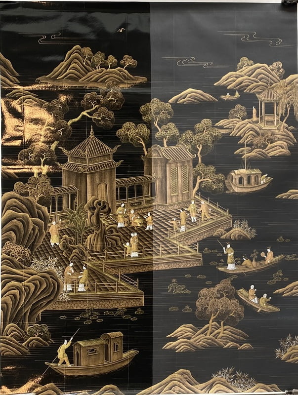 Handpainted landscape and figure gold design on black background. Left half with high gloss lacquer. Mounted on muslin. 95"H X 71"W.