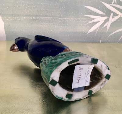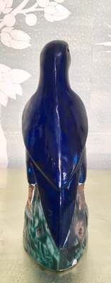 A fanciful and expressive blue glazed parrot seated on attached green base.