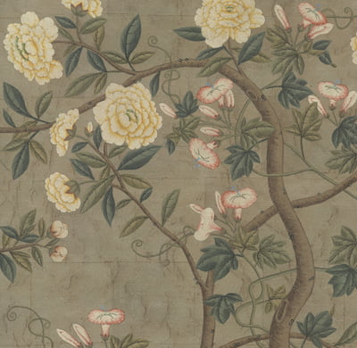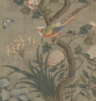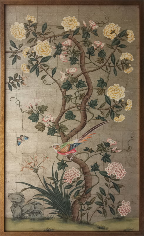 Handpainted lush chinoiserie design in a colorful palette on a pewter textured background. Background is antiqued. In gold frame with patina. 37.75"W X 63.75"H. Part of an available triptych.