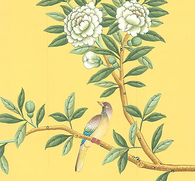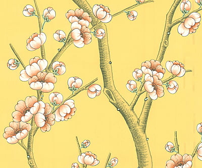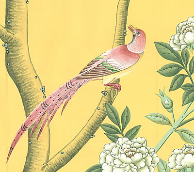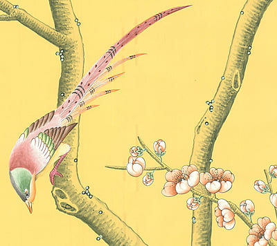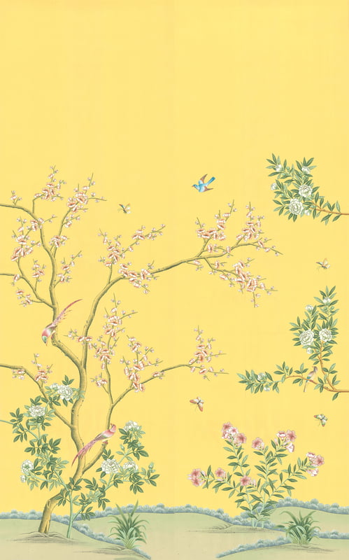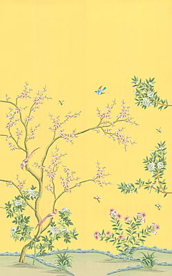 Handpainted Chinese design with flowering trees, birds, and butterflies on a yellow background. Background is non-pieced and non-antiqued. 2 panels at 3'W X 10'H each with a 90" maximum design height.