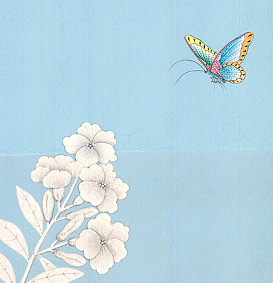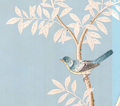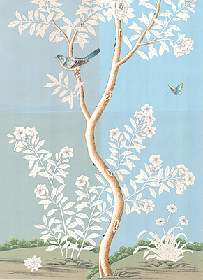 Skylark (SY-26) handpainted wallpaper sample. Background shows four different color/antiquing options. 52"H X 37.75"H.