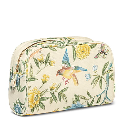 A small canvas beauty bag enhanced with details from the Heathcote scene. Secured with a brass zip closure, it is ideal for storing make-up on a vanity or while traveling, and also makes an elegant gift. Canvas with brass hardware. 5.5"H X 3"D X 8"W