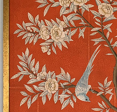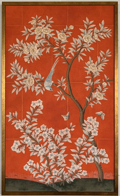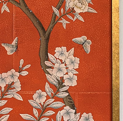 Handpainted Chinese design with flowering trees, birds, and butterflies on an orange background. Background is pieced and antiqued. In gold box frame with patina. 37.75"W X 63.75"H. Complementing pair available.