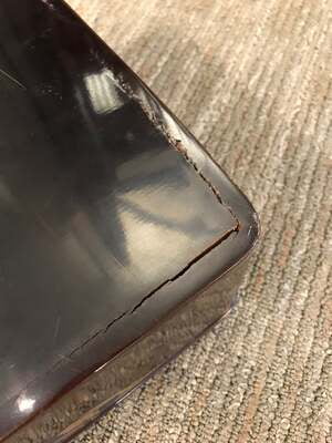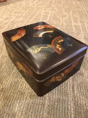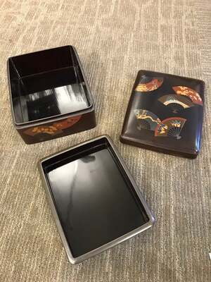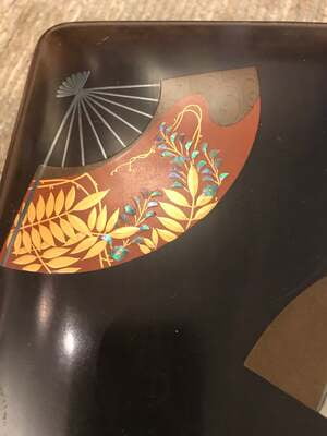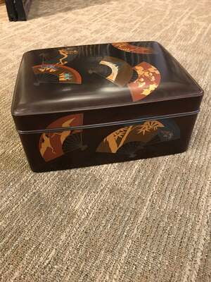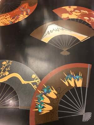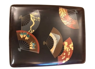 A striking Japanese lacquer box with design of scattered fans with varying patterns.
