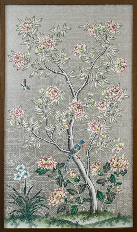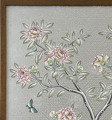 Handpainted Chinese design with flowering trees, birds, and butterflies on a silver background with white fretwork. Background is non-pieced and non-antiqued. In gold box frame with patina. 37.75"W X 63.75"H. Complementing pair available.