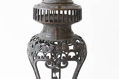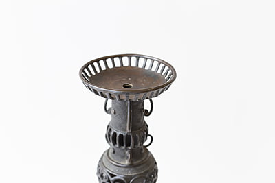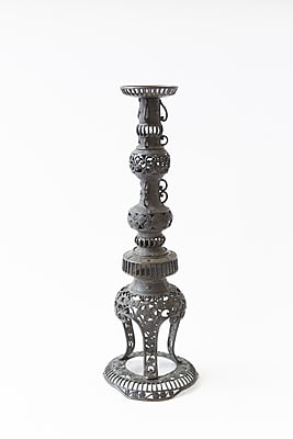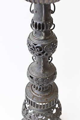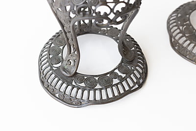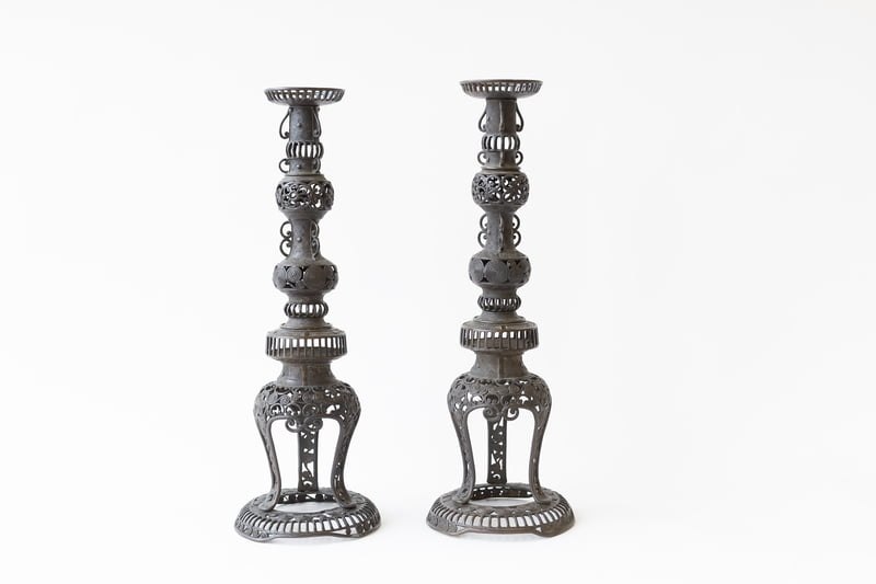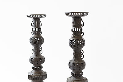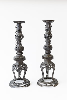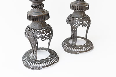 A pair of ornately decorated openwork metal candle stands. These would be gorgeous lamp bases.