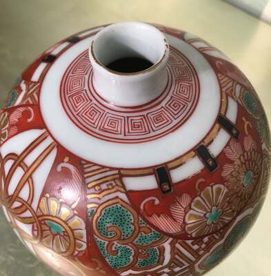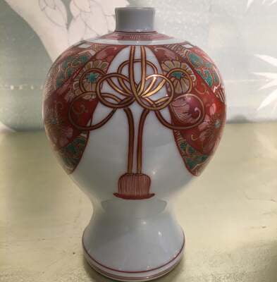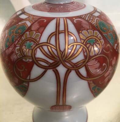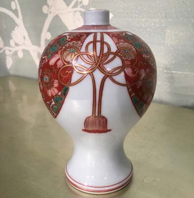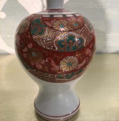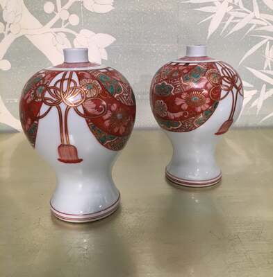 A delicate, graceful pair of Japanese bottle shaped vases with intricate floral and geometric designs in rust and green on white porcelain. 5"W X 7"H EA