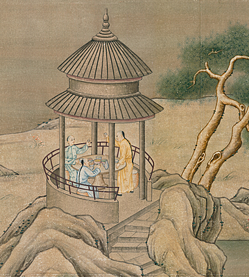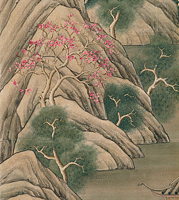 Ming Village (SY-223) handpainted wallpaper sample. Half with a low gloss lacquer finish and half with a high gloss lacquer finish. 60.5"H X 37.75"W.