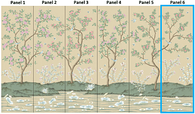 Inspired by traditional Chinese bird-and-flower scenic wallpaper popularized by Europe in the 18th and 19th Centuries, this design features towering trees and flowering bushes that sit above a tranquil pond with floating lily pads and lilies. Designed to allow for trimming some of the pond and/or tops of the trees, our Lily printed scene presents the look of antique wallpaper installations in the tradition of the grand homes of Europe. Each panel measures 3'w x 10'h, and the full repeat is 6 panels wide, with panel 6 connecting to panel 1. The panels can be ordered individually in any quantity, and the minimum order is 1 panel.